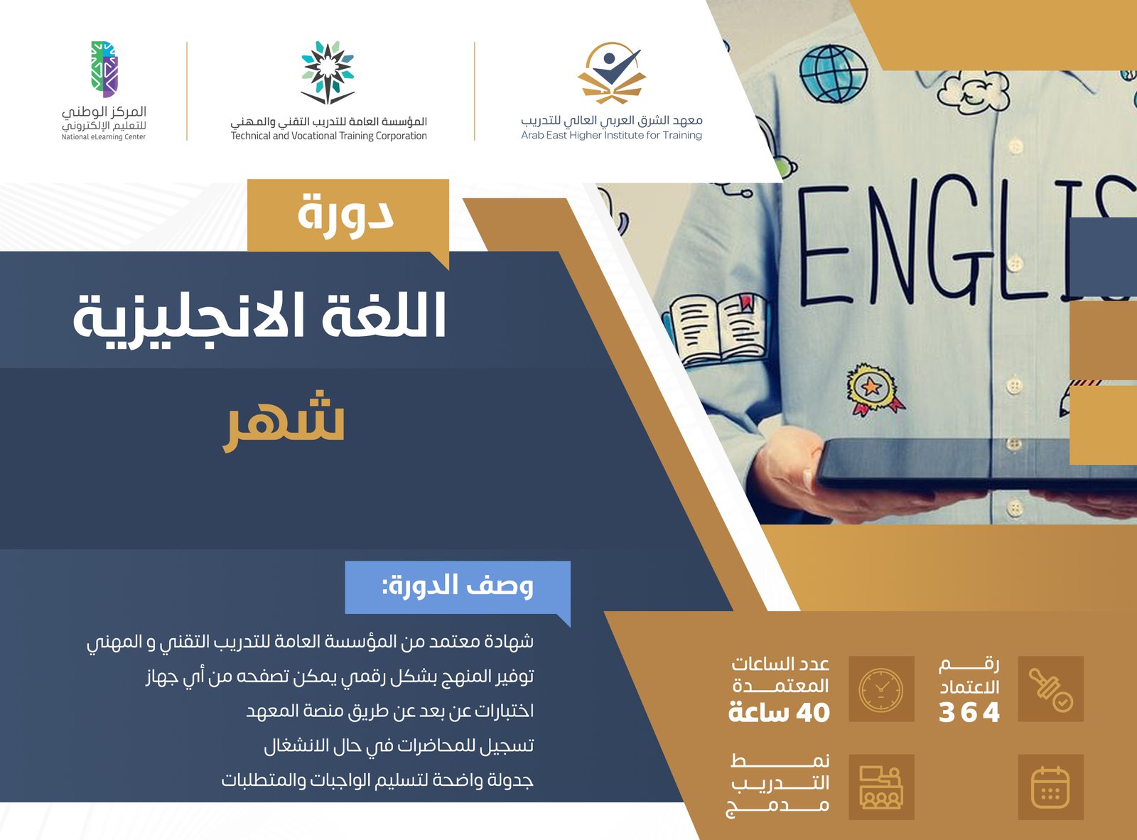 اونلاين/حضوري AM/PMتم تصميم برنامج اللغة الانجليزية لمدة ثلاثة أشهر لتلبية احتياجات الأفراد العاملين الذين يرغبون في